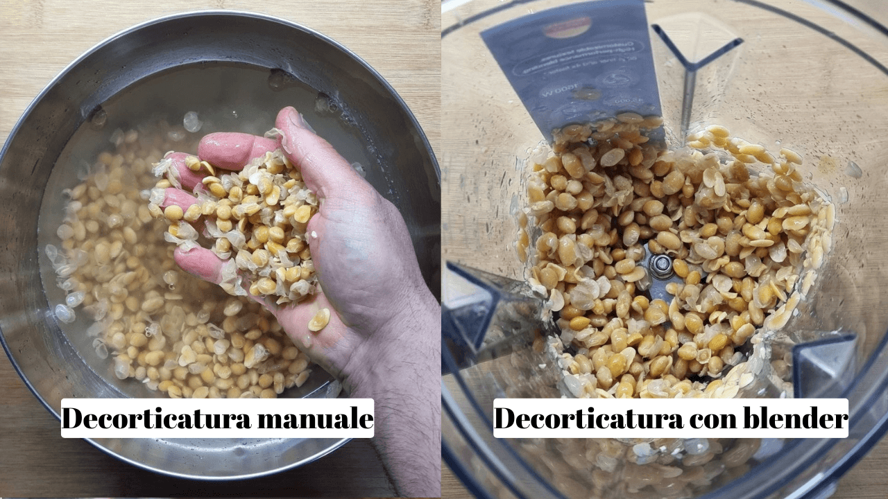 Un metodo molto più veloce consiste nel frullare per pochissimi secondi i legumi ancora crudi ma già ammollati in un blender. Questo aiuta a rompere la buccia e a separarla molto rapidamente, senza perdere troppo tempo.